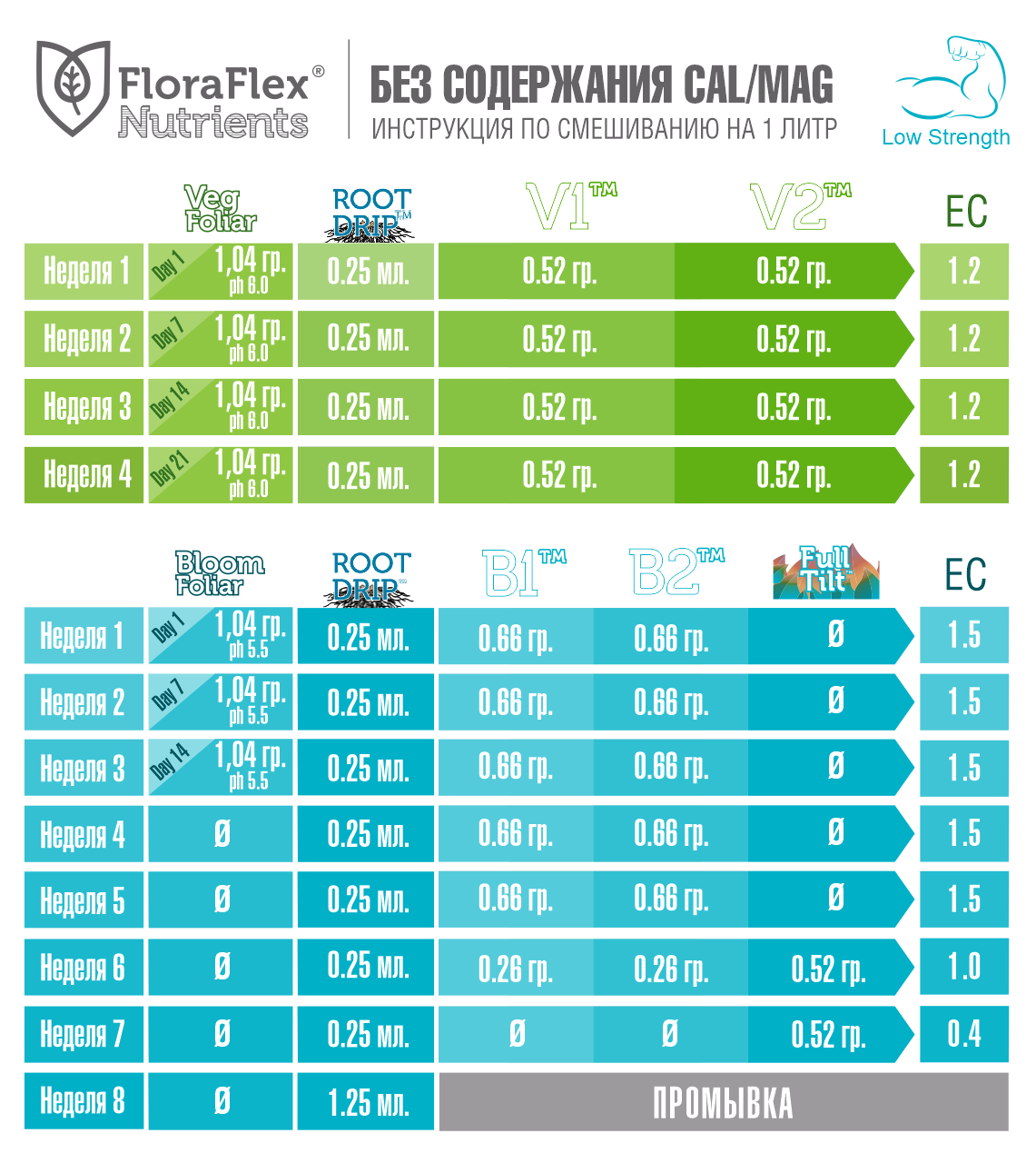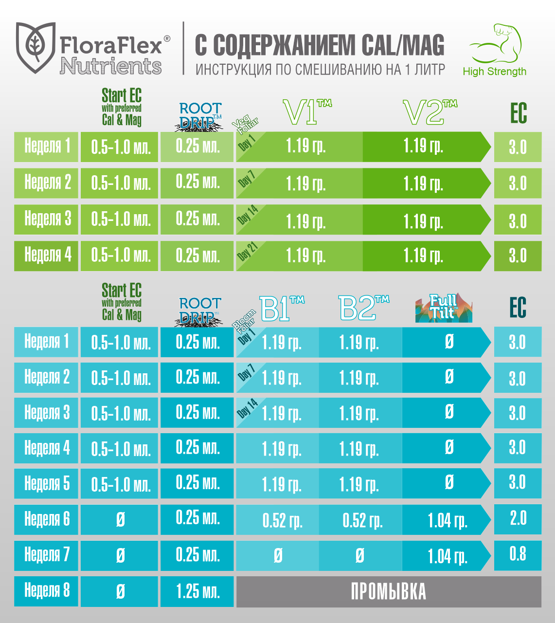 Питание на цветении — компоненты B1 и B2 обеспечивают растения всеми необходимыми макро- и микроэлементами для стабильного и продолжительного цветения. Могут использоваться в качестве базовых удобрений вместе с другими добавками.