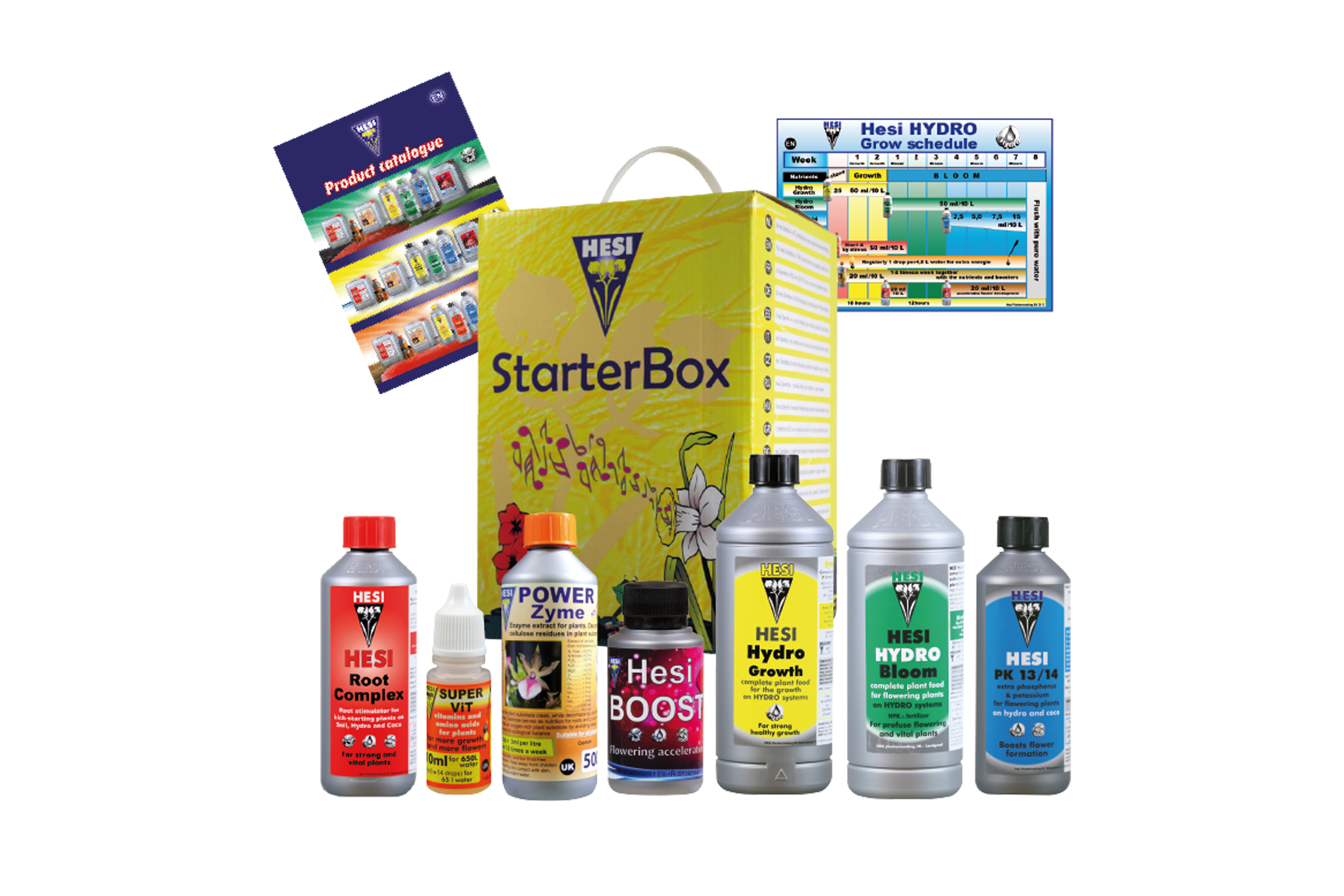 Набор удобрений и стимуляторов полного цикла для гидропоники Hesi® "СтартерБоксГидро" содержит: