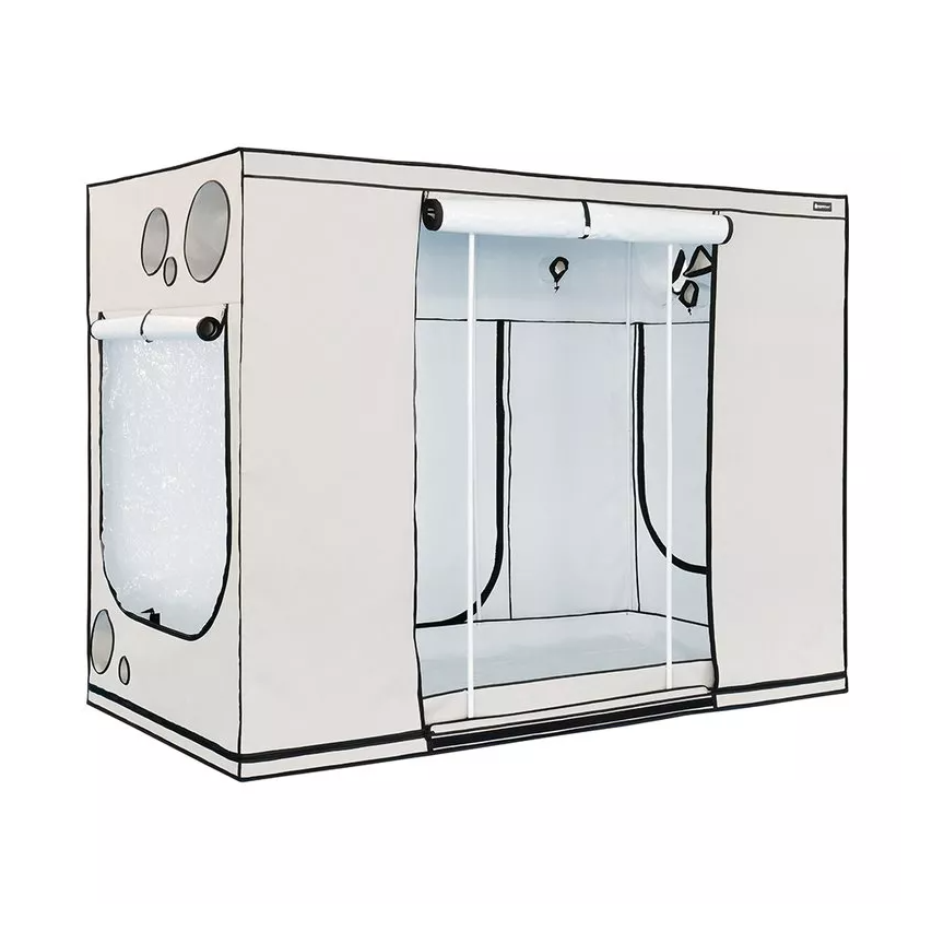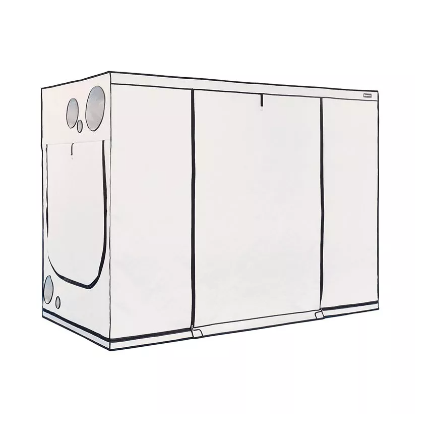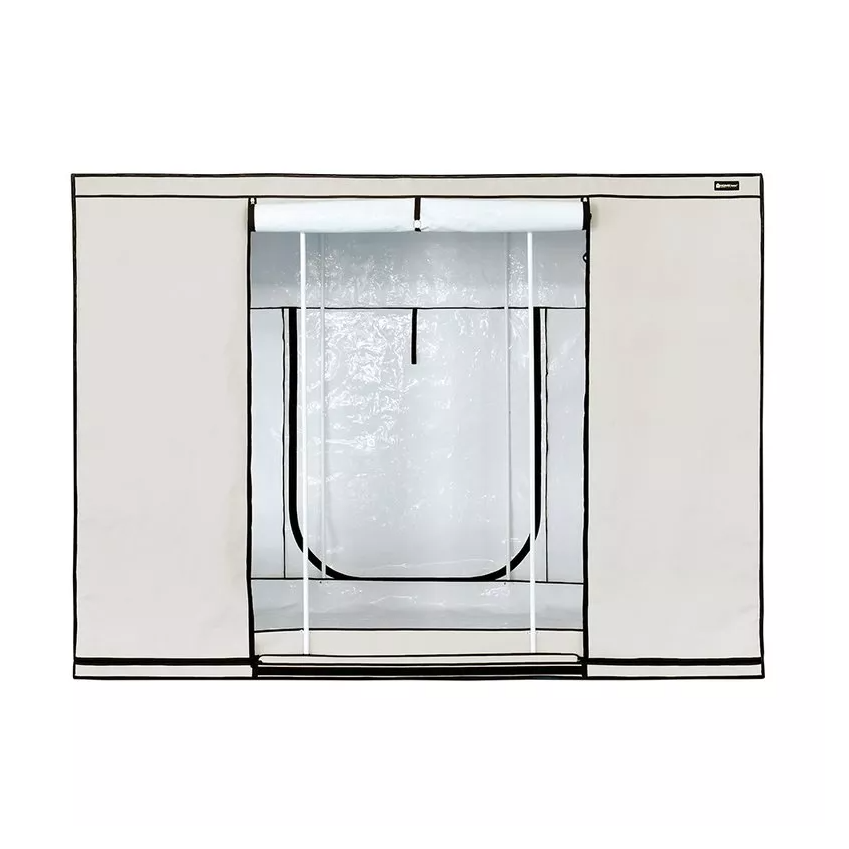 Модель вмещает до трех ламп 600 Вт, но для ее суперпрочного каркаса (Ø 22 мм) эта нагрузка далеко не предел. Некоторые садоводы комбинируют различные виды ламп, чтобы обеспечить свои растения максимальным разнообразием светового спектра. И, конечно, невозможно представить себе такой тент без внутреннего покрытия PAR+! При использовании нескольких ламп выделяется большое количество тепла, поэтому здесь особенно важно защитить растения от излишнего нагревания и дать им максимум полезной энергии PAR – при освещении лампами 1000 Вт мы рекомендуем использовать рефлекторы с воздушным охлаждением.
