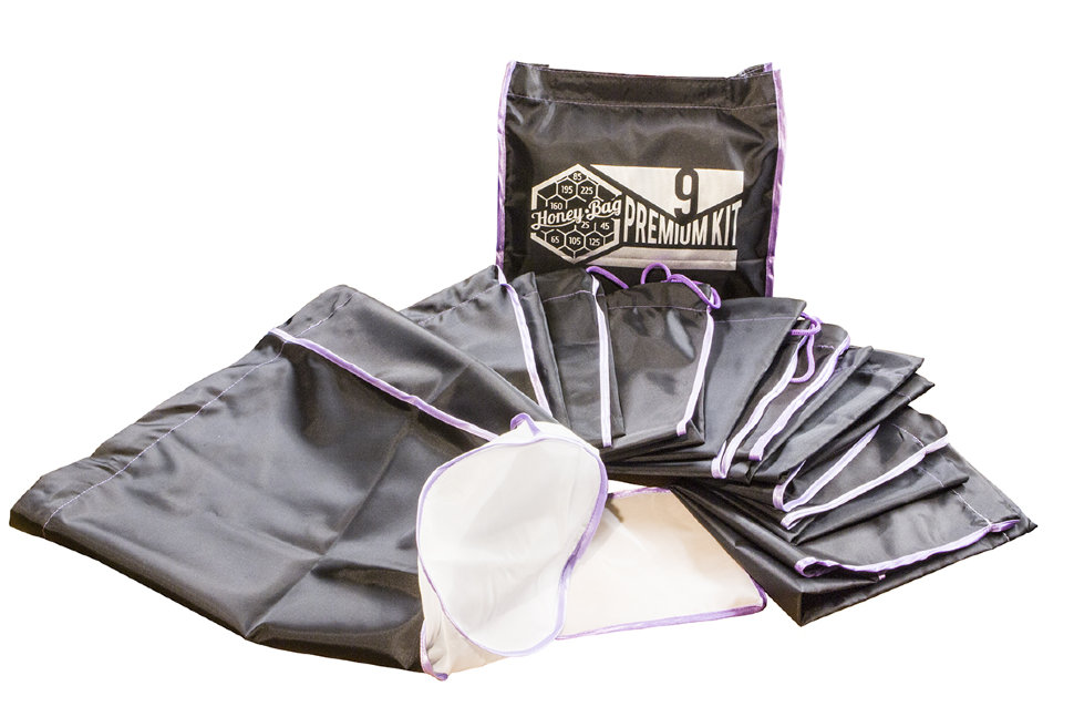 Самый полный набор мешков Honey-Bag Premium KIT9 для ледяной экстракции смол и кристаллов с растений и цветов состоит из 9 мешков по 15 литров: одного рабочего, с размером ячеек сетки 225 микрон и восьми мешков-фильтров с сеткой 195,160,105,125,85,65,45 и 25 микрон.
