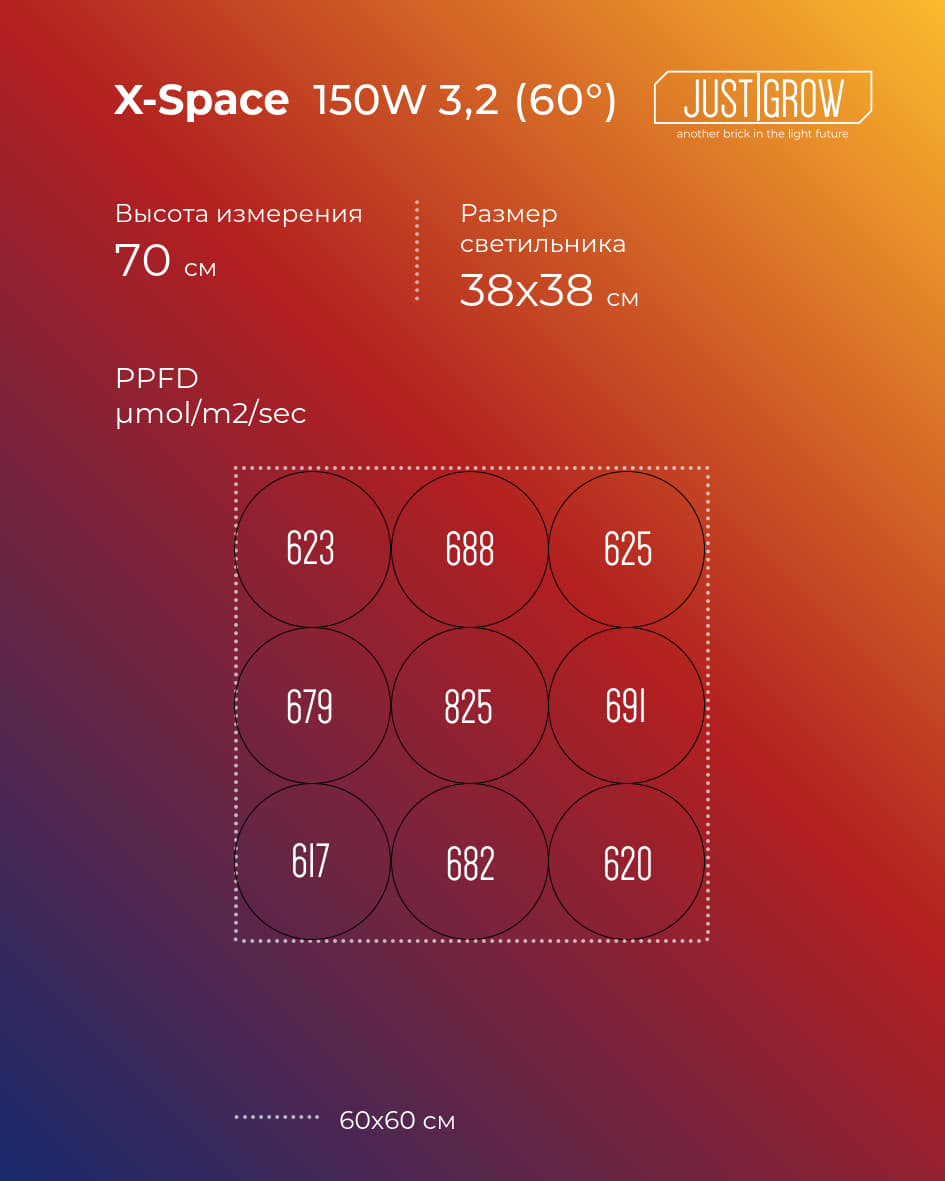 Высокий уровень освещённости (PPFD) и равномерное распределение света с отклонением менее 20%.