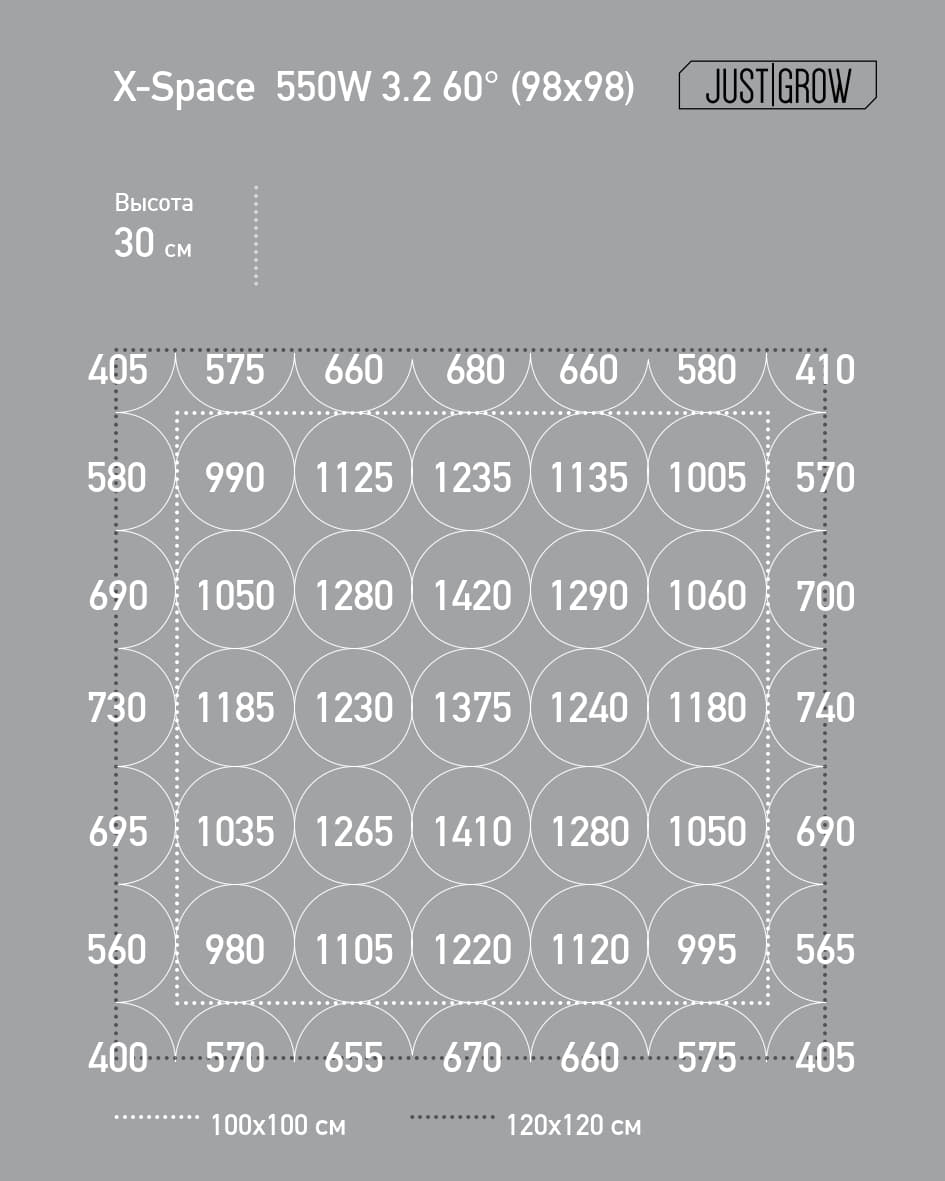 Высокий уровень освещённости (PPFD) и равномерное распределение света с отклонением менее 20%.