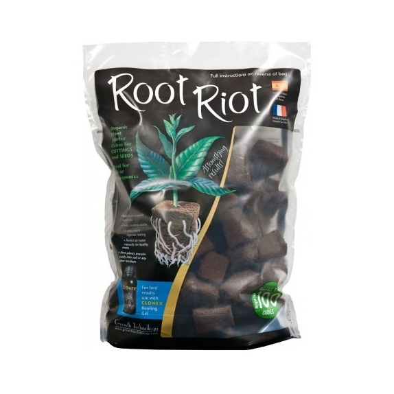 Пробки, изготовленные по технологии «Root Riot» - инновация компании Hydrodynamics International and Growth Technology. Полностью органические кубики изготовлены из компостированных продуктов переработки древесной коры и предварительно замоченные в растворе бенифицарной микоризы, способствующей развитию корневой системы растений. Пробки идеальны для последующего укоренения как в гидропонной системе, так и в почве за счет идеального соотношения увлажненности и воздухопроницаемости. После появления второго листка у растения, пробку без труда можно поместить в почву, беспочвенную смесь, в аэро-гидропонную систему или минеральную вату.