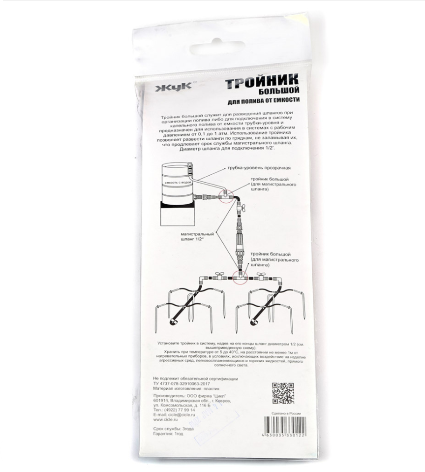 Тройник большой для капельного полива от ёмкости 1/2″ нужен для того, чтобы развести шланги. Также может использоваться в тех случаях, когда к емкости нужно подключить трубку-уровень, обеспечивающую функционирование системы капельного полива. Позволяет развести шланги по участку так, чтобы они не заламывались и не повреждались. Это позволяет им долго служить, не протекая, не ломаясь и не лопаясь. Тройник подходит для систем, минимальное давление в которых составляет 0,1 атм, а максимальное – 1 атм