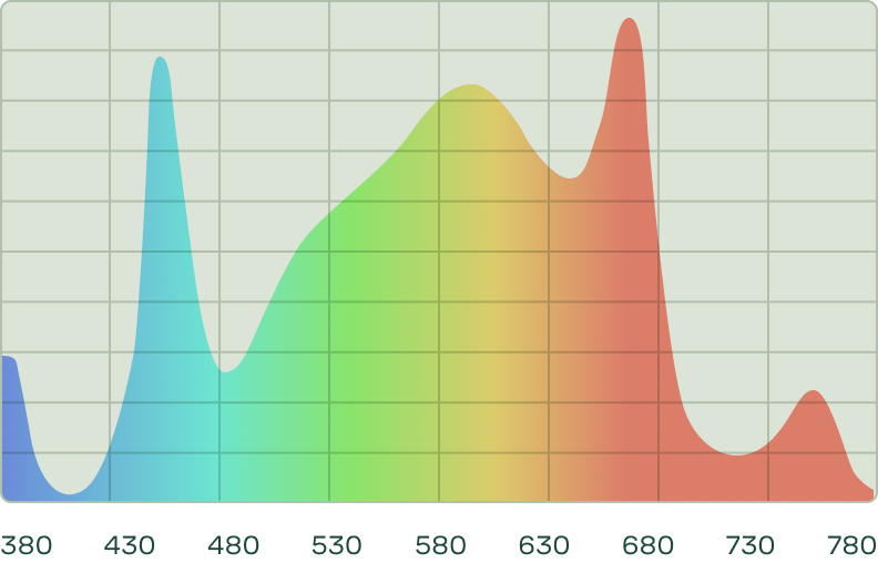 Универсальный спектр, идеальный для растений на стадиях вегетации (набор зеленой массы)и на стадии цветения (набор массы соцветий/плодов растения).