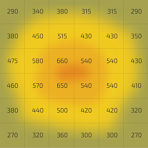 Световой поток в диапазоне 380-780 nm не менее 800 umol/m2*s-1 в центре лампы с расстояния 30 см