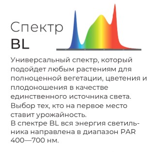 Увеличение пика синего цвета в основном спектре стимулирует быструю вегетацию и набор биомассы растений. На стадии цветения и плодоношения синий спектр повышает содержание вторичных метаболитов, увеличивает урожайность и плотность структуры плодов.