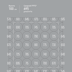 Применение оптики повышает уровень PPFD на 20-30% (в сравнении с замерами без оптики на разных высотах измерений).